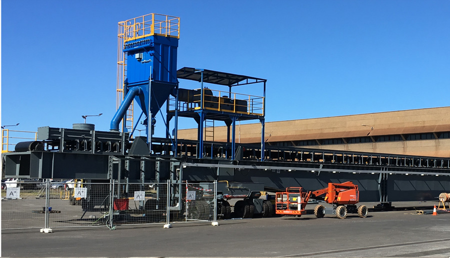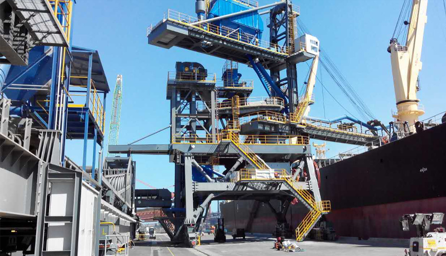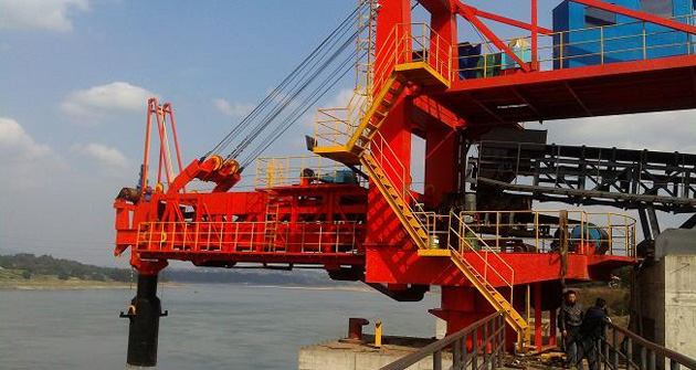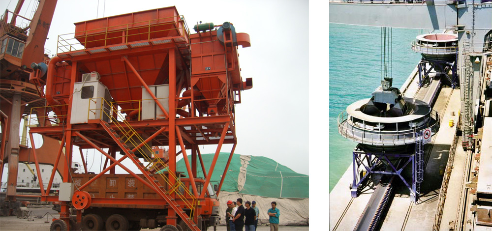 无轨道移动式装船机,行走装置有轮胎、履带两个系列,物料进入装船机的方式有:1)自卸卡车直接倒料的进料装置,每套进料装置的接受能力为625m3/h,弧形悬臂式可配置两套进料装置,装船能力达到1200m3/h,塔式可配置四套进料装置,装船能力达到2400m3/h;2)装载机进料的料仓;3)皮带机进料的料斗。有轨道移动式装船机,如圆弧轨道式、直线轨道式、前直线轨道摆动和后直线轨道摆动。对于水文落差较大的码头,采用在浮式趸船安装1-2台圆弧轨道式,直线轨道式需要配置相应的尾车输送机,摆动式装船机适用于环保要求较高的码头,采用大跨距的回转桥架,完成长大舱口的覆盖面积。对于船型很小或移船方便的码头,为减少投资,可选用墩座式装船机。袋包装船有螺旋滑槽式和托辊式。